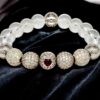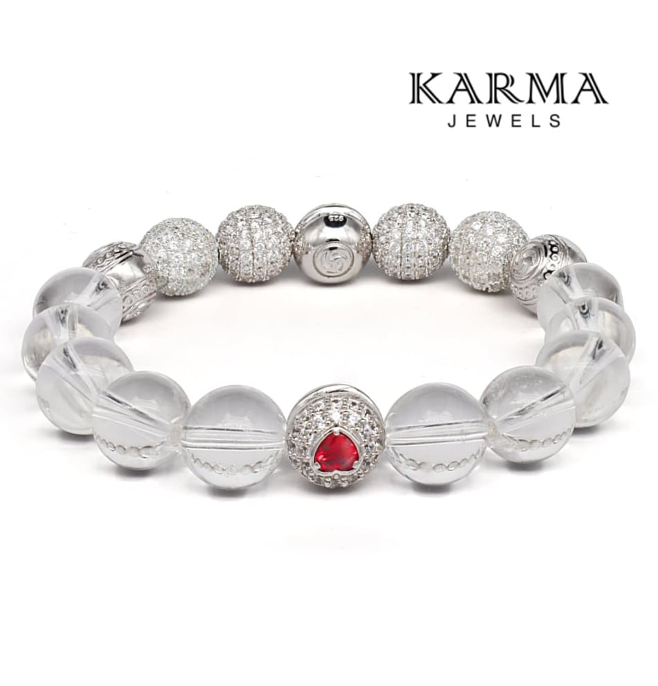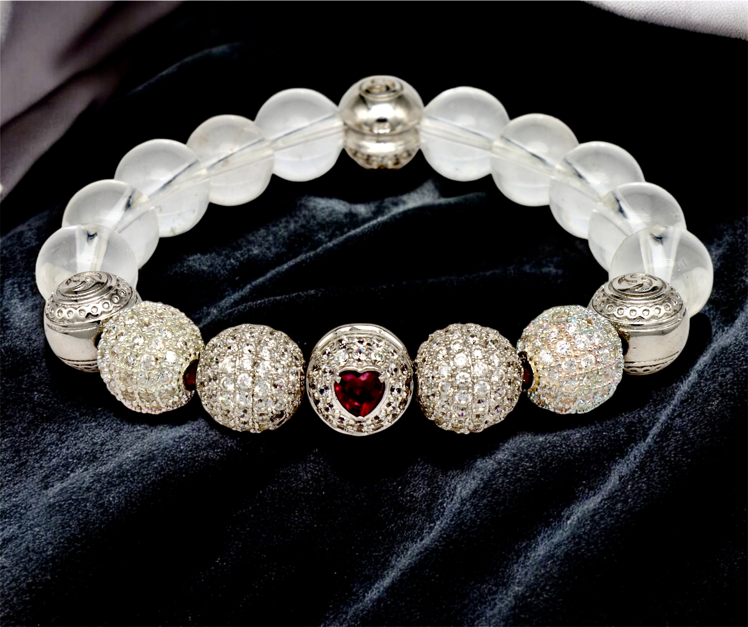 - Центральные элементы: Бусины из серебра с инкрустацией цирконами в виде красного сердца, которые привлекают внимание и добавляют браслету романтичности.